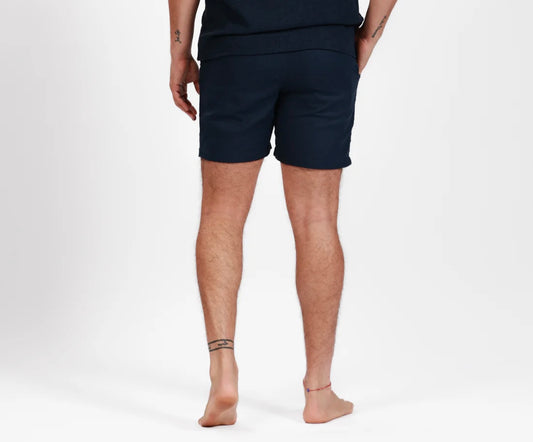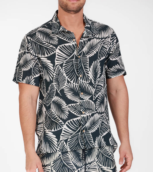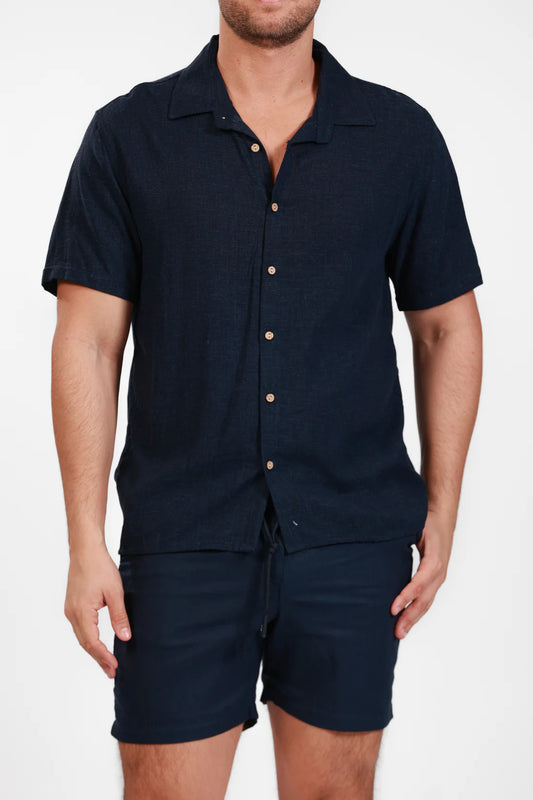 NAVY LINEN SHORT SLEEVE BUTTON DOWN SHIRT