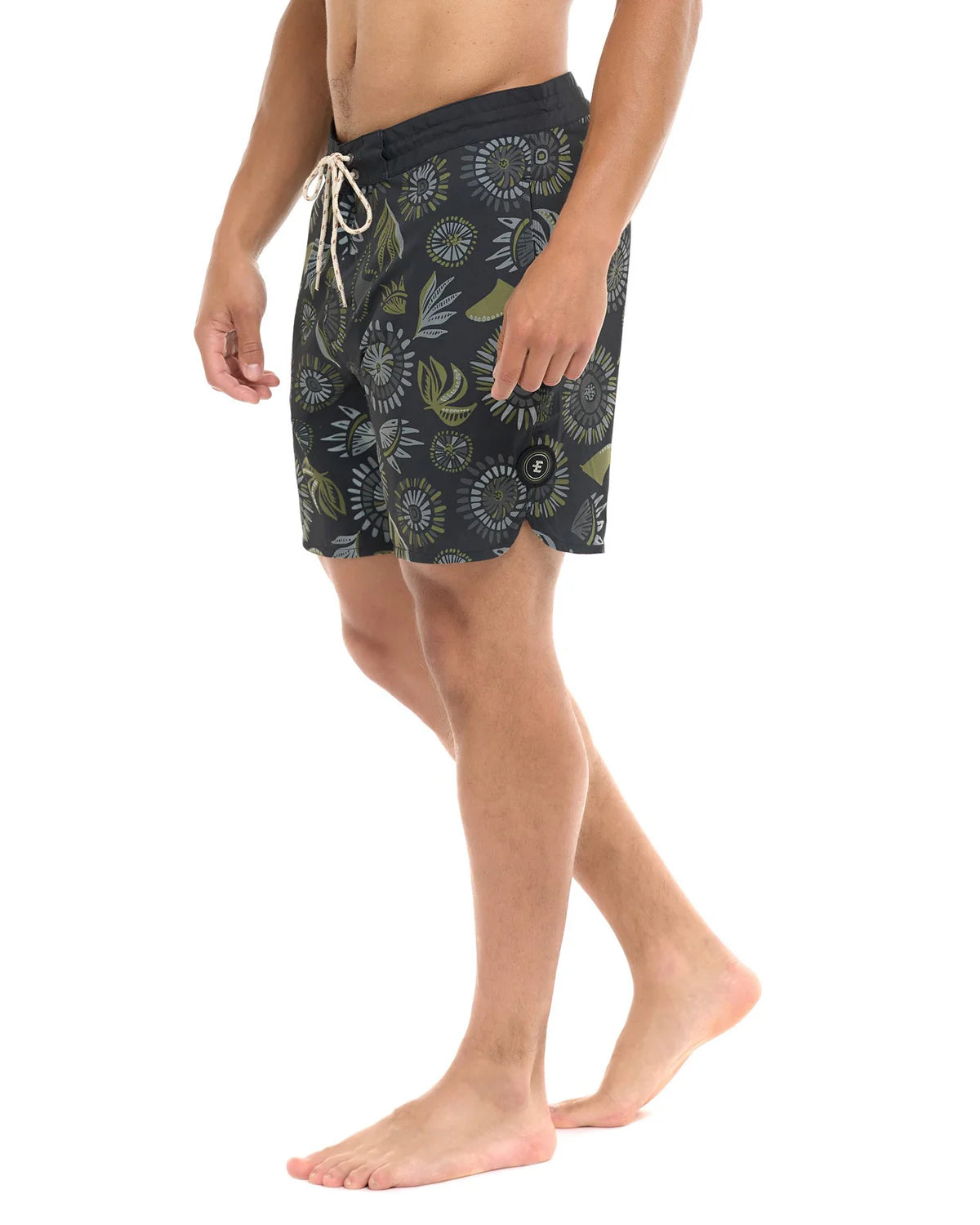 Where style meets the sea. With recycled polyester/spandex, these boardshorts boast an outside drawstring waist for a fit that's just right. Side pockets with mesh and a back patch pocket with button closure bring convenience. Leg vents ensure comfort in every wave. The woven label patch and novelty jacquard loop add a playful touch. Prepare for beachside adventures that stand out.