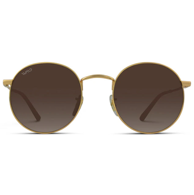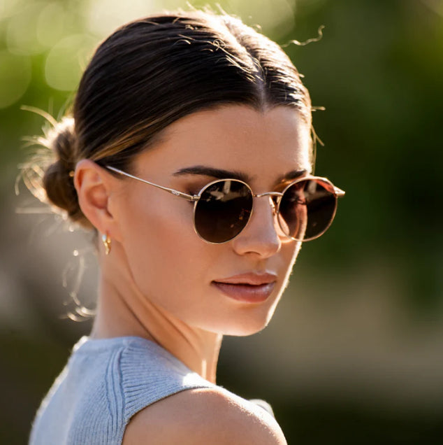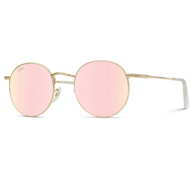 Step into the sun with confidence in the round, mirrored Nevada frame. These shades give a modern look to a retro-style frame. Choose from the green, blue, or pink lenses, each enveloped in a classy gold metal frame to ensure you'll stand out in every crowd.