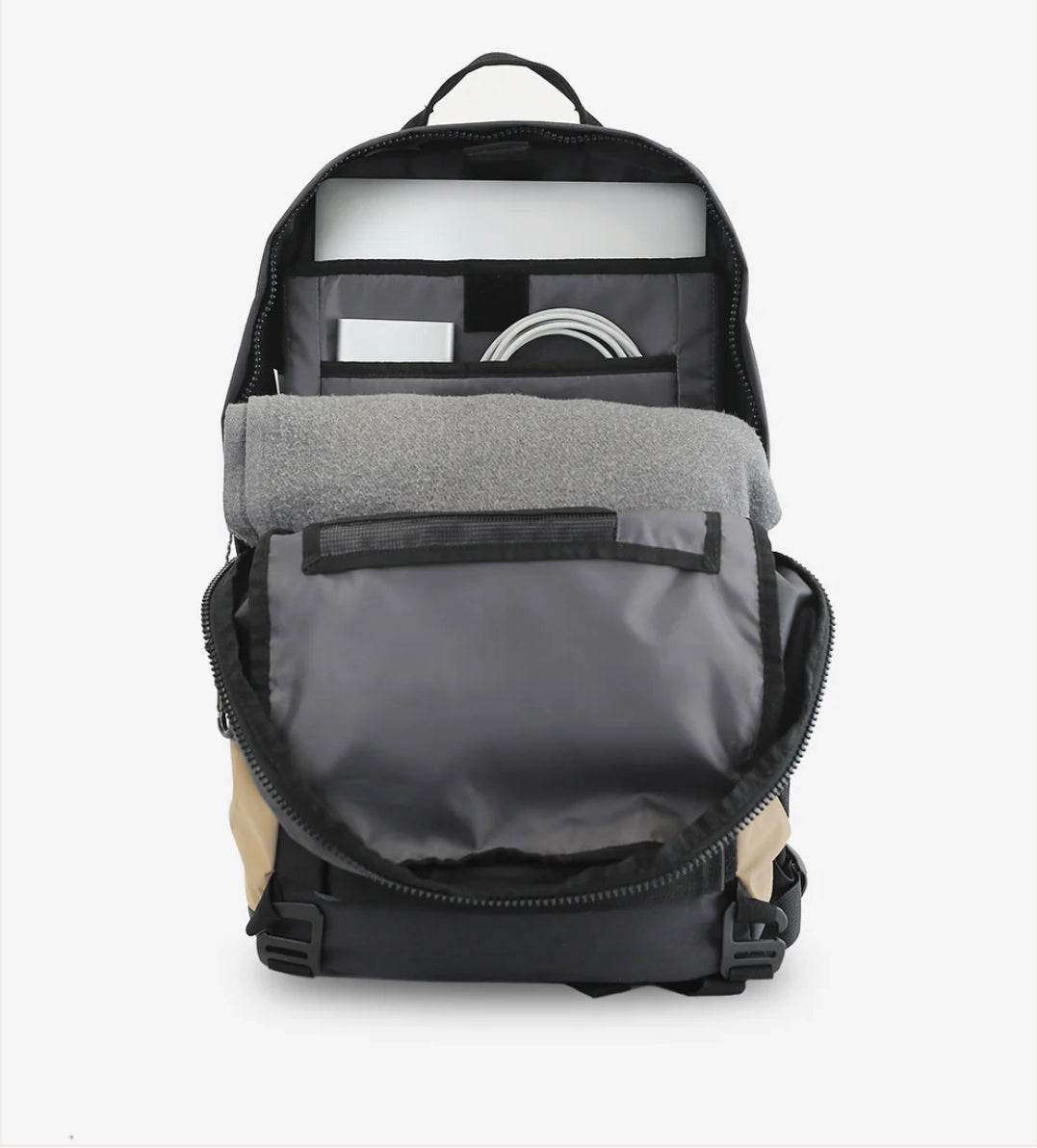 This 20-liter backpack features a large central pocket with a padded 15’’ laptop compartment, an internal divider, two side stretch pockets, two front secure-zip pockets, and a back zipper for easy access.